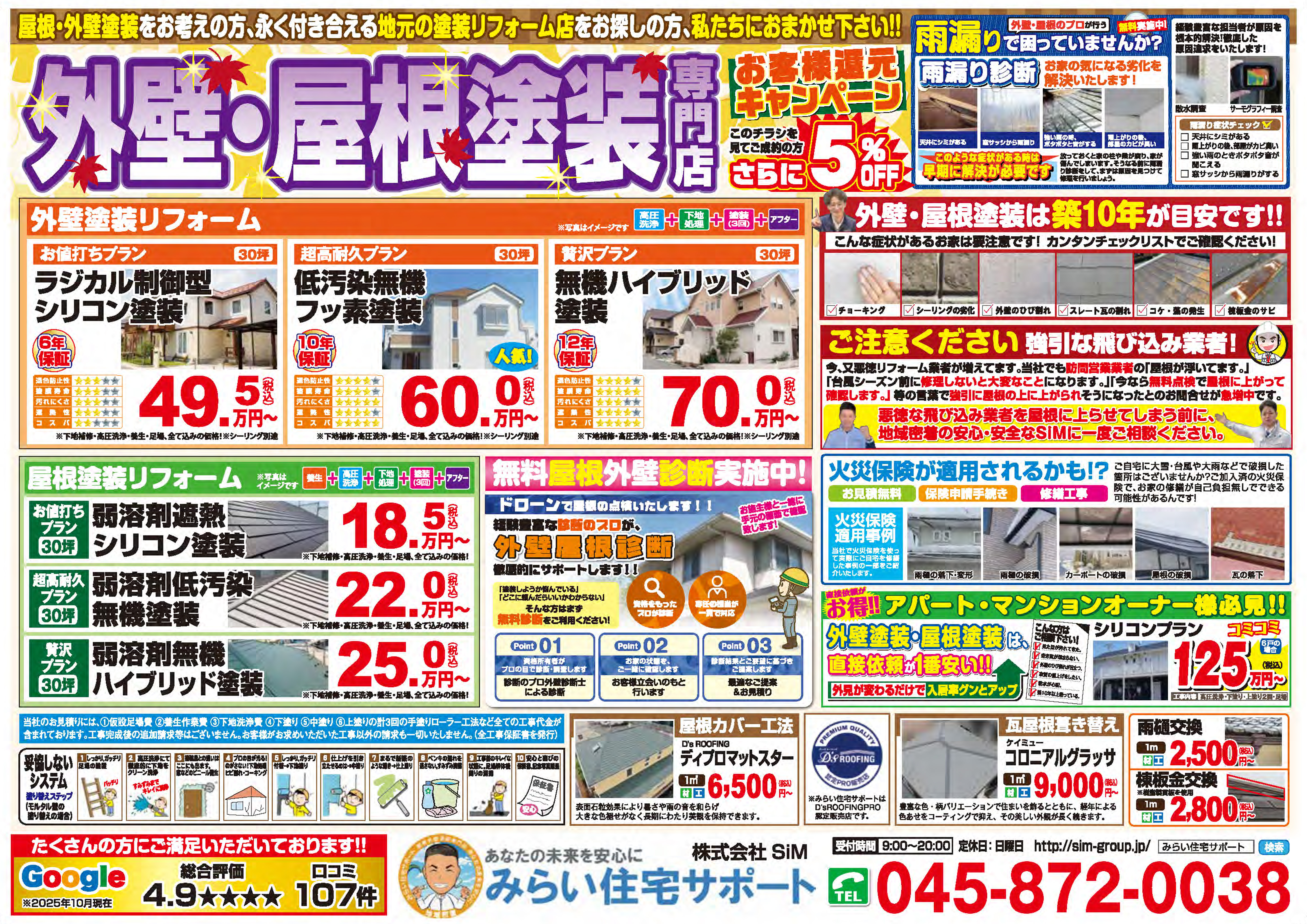 工事保証は5年〜最長15年でお出ししております。これは内容やプランにより異なりますので詳しくは担当者にお問い合わせください。